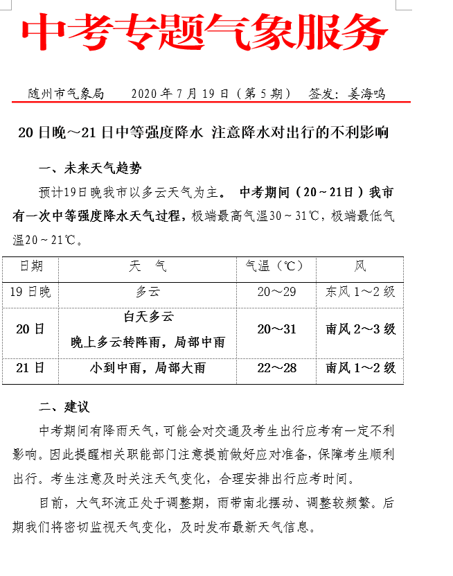 隨州市中考期間天氣狀況