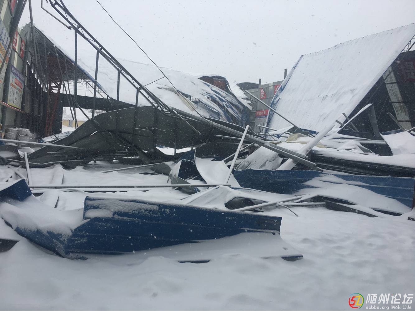 隨州論壇訊 棗陽隨州交界的隨陽店,一工棚被大雪下垮,提醒各部門加強安全防護!