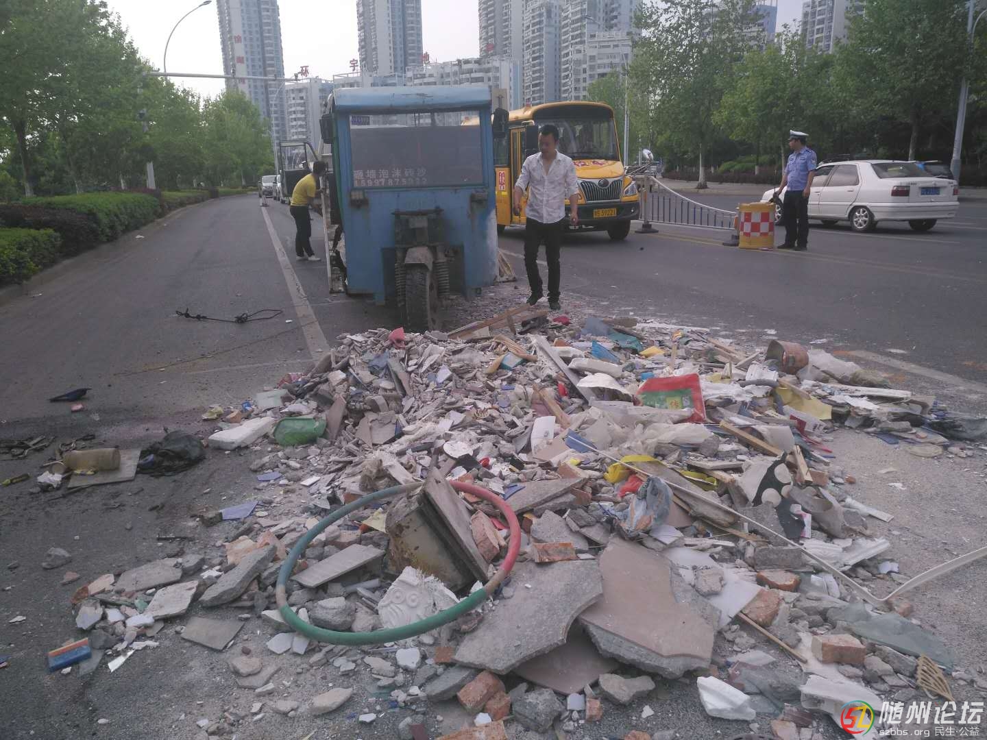 4月20日下午4點30分,神農(nóng)大道水郡世家路段有一輛無牌三輪車發(fā)生交通事故,滿載建筑垃圾的三輪車被撞翻,建筑垃圾全部傾翻在神農(nóng)大道,造成車輛擁堵。市容環(huán)境衛(wèi)生局接到通知后,要求清掃處快速清除建筑渣土,清掃 ...