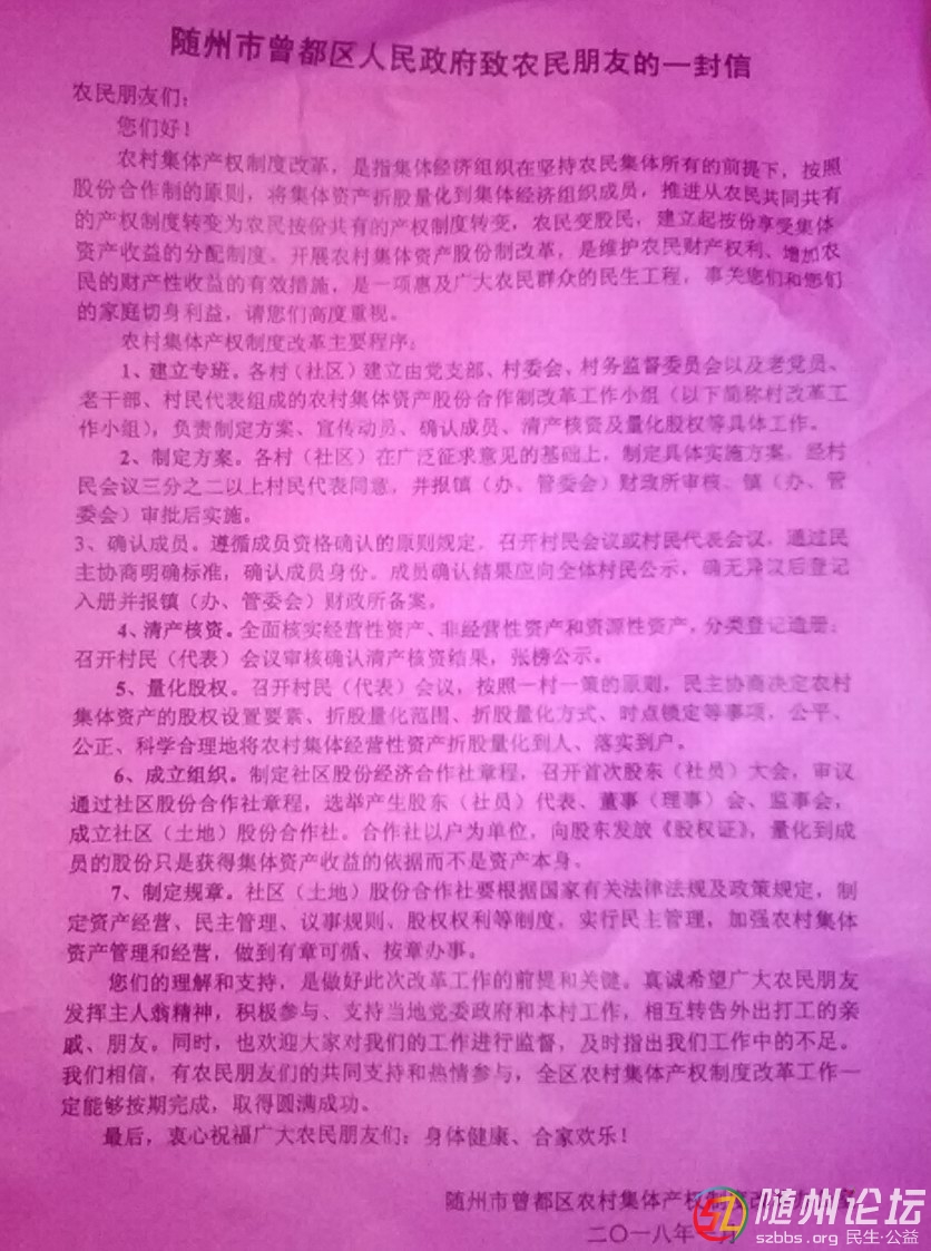 正文摘要:本帖最后由 決戰(zhàn) 于 2018-6-13 22:09 編輯 今天回家,看見家里有一張這樣的曾都區(qū)農(nóng)村集體產(chǎn)權制度改革辦公室發(fā)的文件。 家里老人說是村里工作人員上門宣傳的,還讓簽字,說先學習,之 ... |