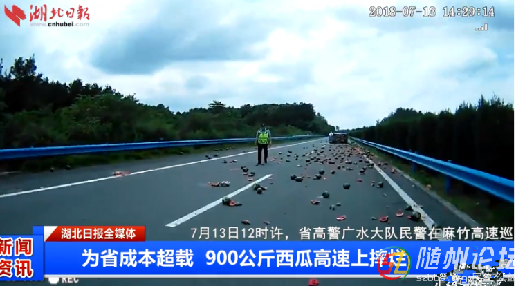 正文摘要:7月13日12時許,省高警廣水大隊民警在麻竹高速巡邏時,發(fā)現(xiàn)一輛銀色的輕型貨車發(fā)生了側翻事故,路上灑落的全是西瓜。司機陽某某說,為了節(jié)省成本,他超載運送900公斤西瓜到廣水市城區(qū)賣,高速上以90碼的時速行駛,沒 ... |