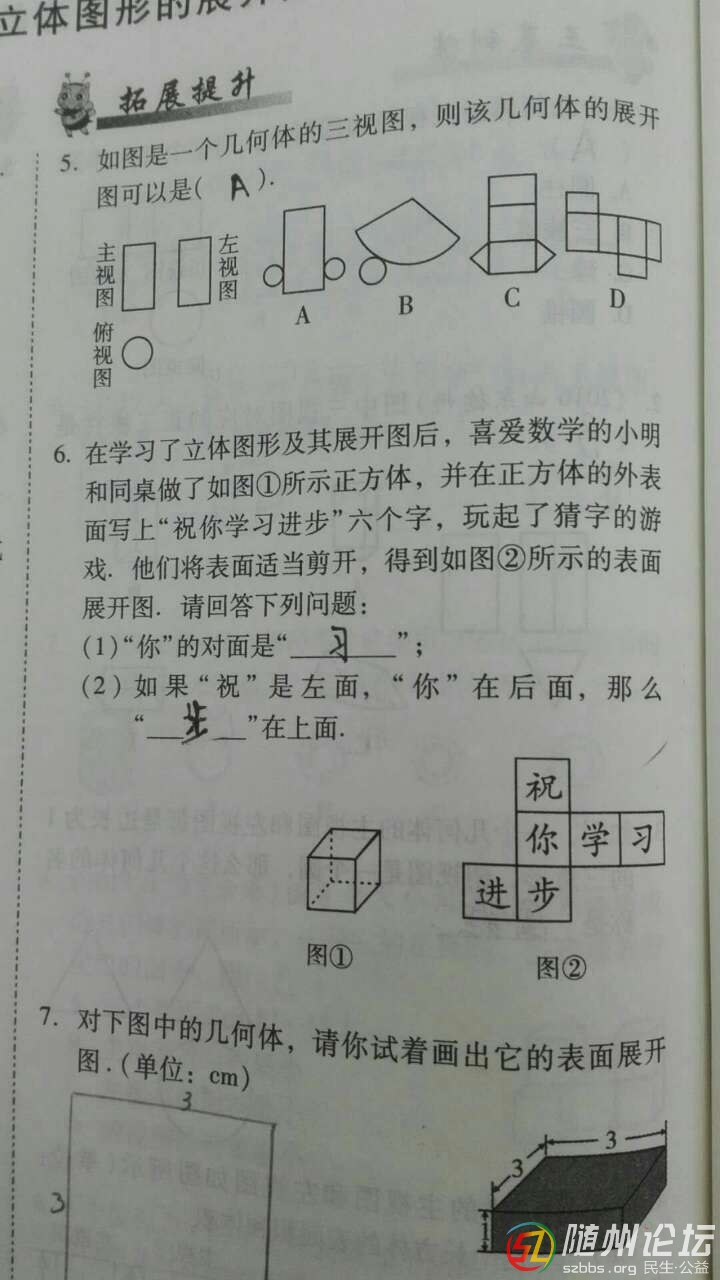 本帖最后由 撒加 于 2019-1-21 10:29 編輯 我是淅河娃子 發(fā)表于 2019-1-21 07:52 我很負(fù)責(zé)的告訴你,這種題5年級(jí)和7年級(jí)必考!7年級(jí)在上學(xué)期的第4章,5年級(jí)應(yīng)該也在上學(xué)期,具體哪一章我忘了。圓柱體從上面看是圓形,從正面,左面看都是長(zhǎng)方形。 第6題,正方體復(fù)原,需要一點(diǎn)點(diǎn)空間想象和翻轉(zhuǎn)能力,如果確實(shí)不會(huì),也可以比著畫一個(gè)展開(kāi)圖再拼起來(lái)! |
