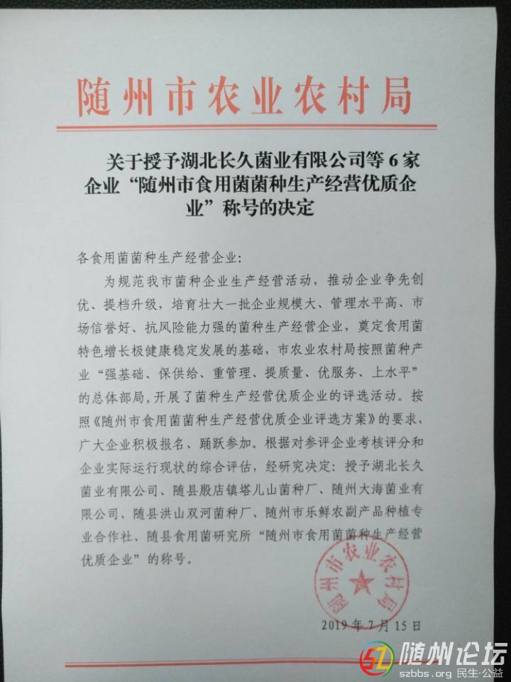 關(guān)于授予湖北長久菌業(yè)有限公司等6家企業(yè)“隨州市食用菌菌種生產(chǎn)經(jīng)營優(yōu)質(zhì)企業(yè)”稱號的決定