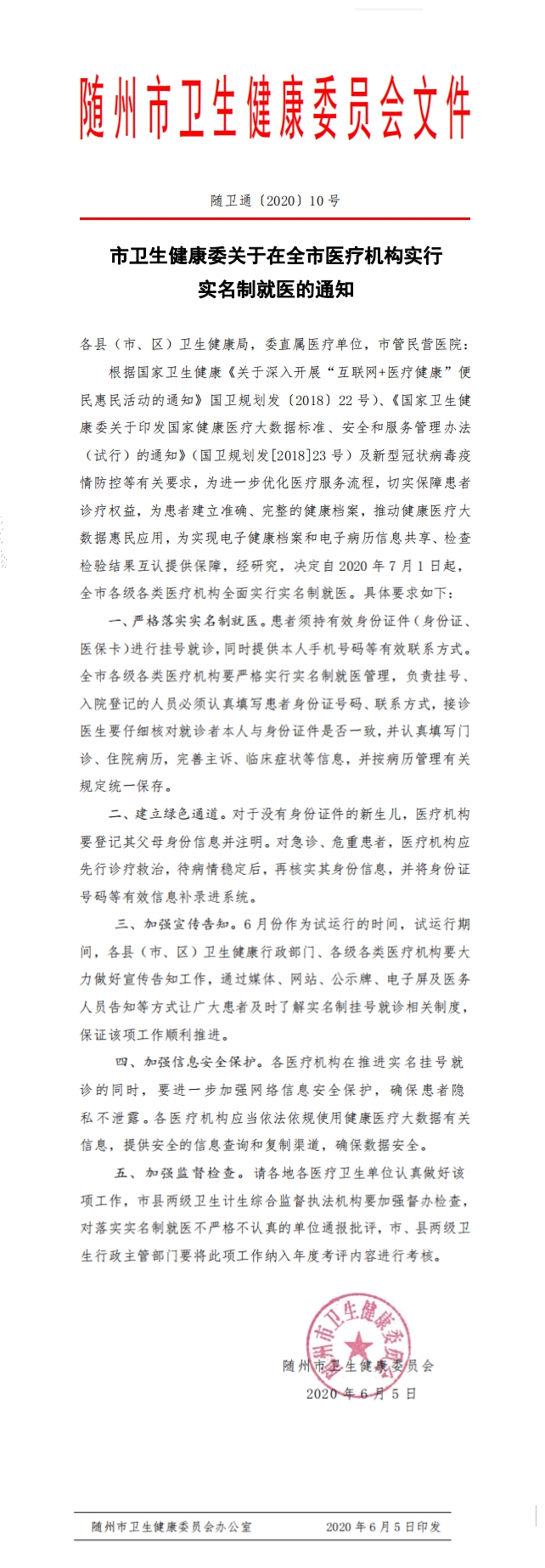 隨州市衛(wèi)生健康委關(guān)于在全市醫(yī)療機(jī)構(gòu)實(shí)行實(shí)名制就醫(yī)的通知(代發(fā))