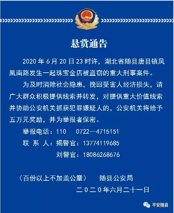 本帖最后由 狼的誘惑 于 2020-6-25 16:51 編輯 懸賞通告 2020年6月20日23時(shí)許,湖北省隨縣唐縣鎮(zhèn)鳳凰南路發(fā)生一起珠寶金店被盜竊的重大刑事案件。 為及時(shí)消除社會(huì)隱患,挽回受害人經(jīng)濟(jì)損失,請(qǐng)廣大群眾積極提供 ...