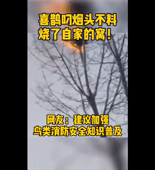 本帖最后由 隨州日報(bào) 于 2020-7-16 08:51 編輯 7月14日下午,@天津消防 在微博上分享了一段視頻,內(nèi)容是一只喜鵲叼煙頭筑巢,不料卻是徹底燒了自己的窩。 有網(wǎng)友留言調(diào)侃,建議加強(qiáng)鳥 ...