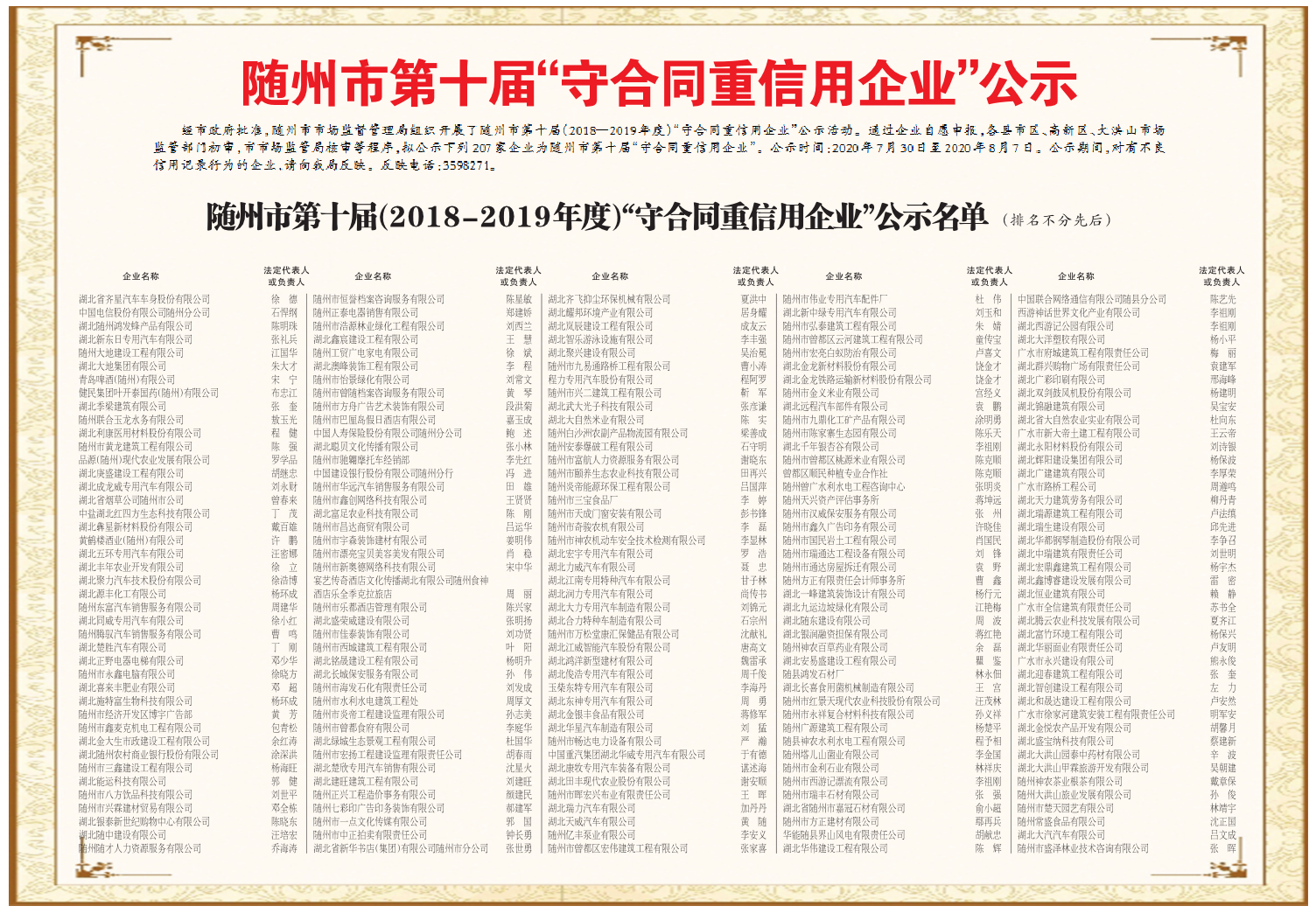 隨州市第十屆“守合同重信用企業(yè)”公示
