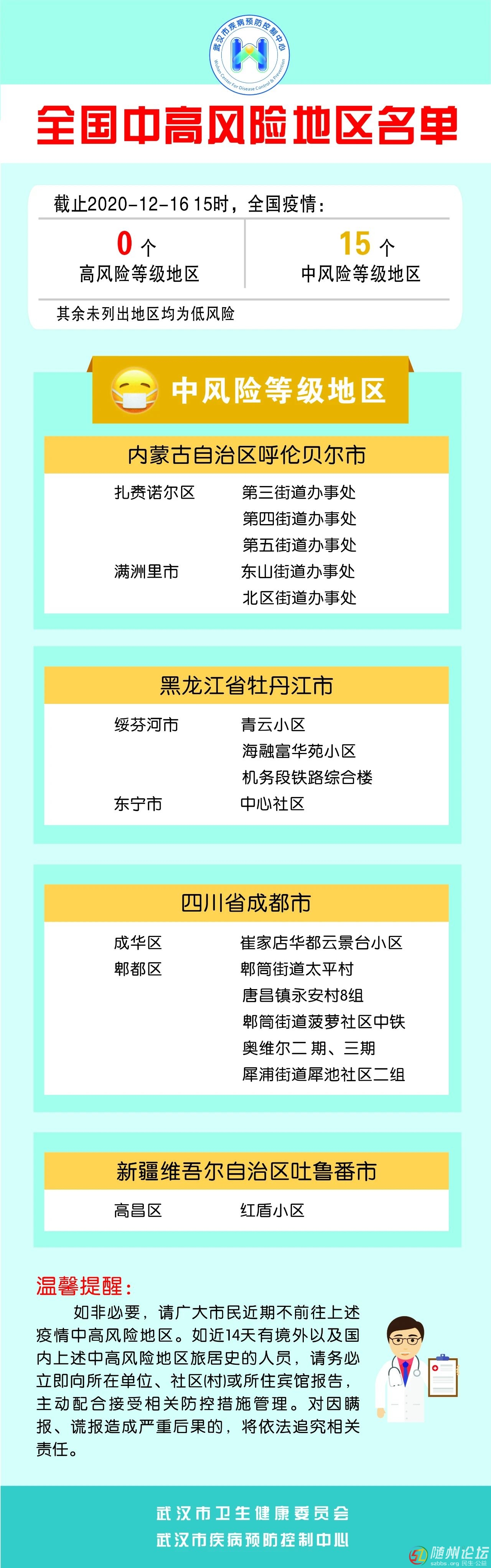 12月16日武漢市疾控中心發(fā)布了“全國(guó)疫情中高風(fēng)險(xiǎn)地區(qū)最新名單” 并進(jìn)行了溫馨提示 來(lái)源:武漢市疾病預(yù)防控制中心