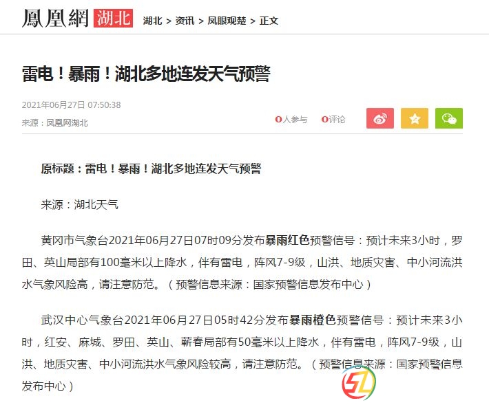 【資訊】 雷電!暴雨!湖北多地連發(fā)天氣預警
