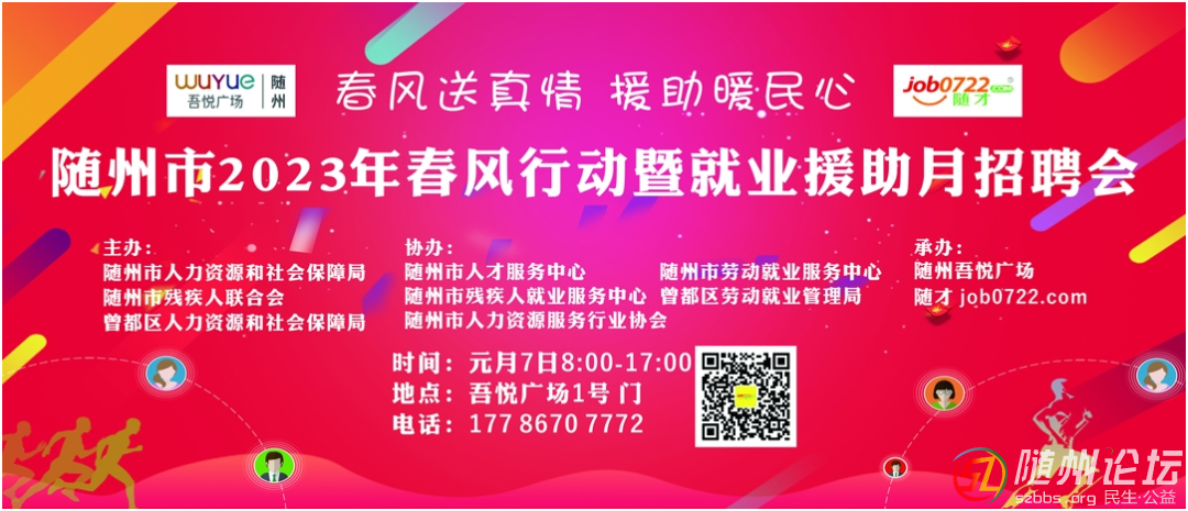 為全面貫徹黨的二十大精神,堅(jiān)決落實(shí)黨中央、國(guó)務(wù)院關(guān)于就業(yè)工作決策部署,隨州市人力資源和社會(huì)保障局、隨州市殘疾人聯(lián)合會(huì)、曾都區(qū)人力資源和社會(huì)保障局定于2023年一季度開展“2023年春風(fēng)行動(dòng)暨就業(yè)援 ...