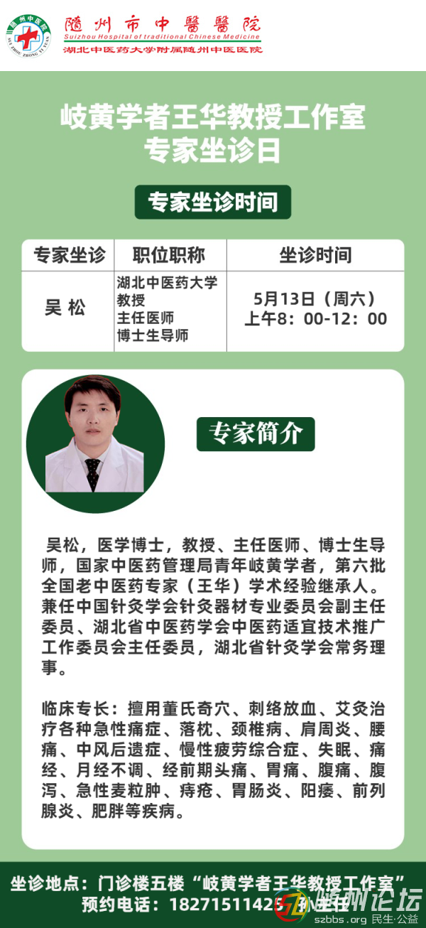 “岐黃學(xué)者王華教授工作室”吳松教授5月13日(本周六)上午來(lái)中醫(yī)醫(yī)院坐診