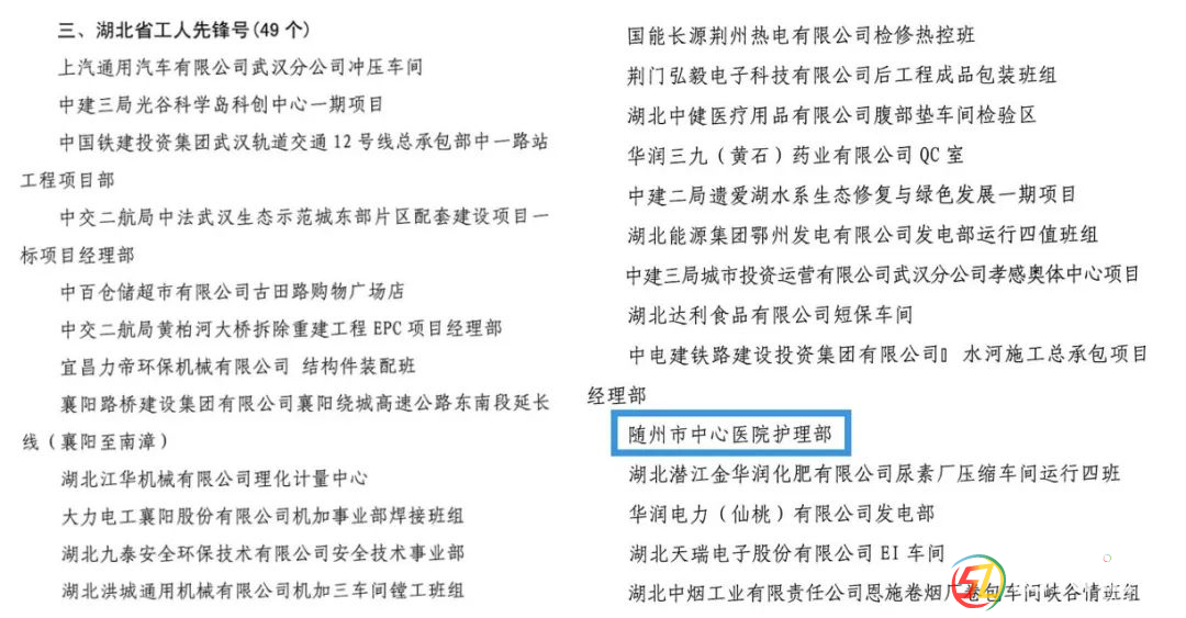 隨州市中心醫(yī)院護(hù)理團(tuán)隊(duì)榮獲“湖北省工人先鋒號” 近日,省總工會對在2023年全省勞動競賽中涌現(xiàn)出的先進(jìn)集體和先進(jìn)個人通報(bào)表彰,隨州市中心醫(yī)院護(hù)理部榮獲“湖北省工人先鋒號”稱號。 ...