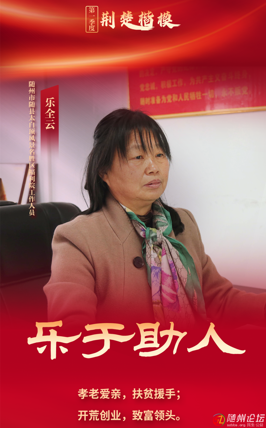 本帖最后由 隨州日?qǐng)?bào) 于 2024-4-3 09:32 編輯 隨州日?qǐng)?bào)訊(通訊員黃杰)近日,“荊楚楷?!?024年第一季度上榜人物名單揭曉,隨縣太白頂風(fēng)景名勝區(qū)福利院工作人員樂(lè)全云上榜。 樂(lè)全云,女,以前在太白 ...