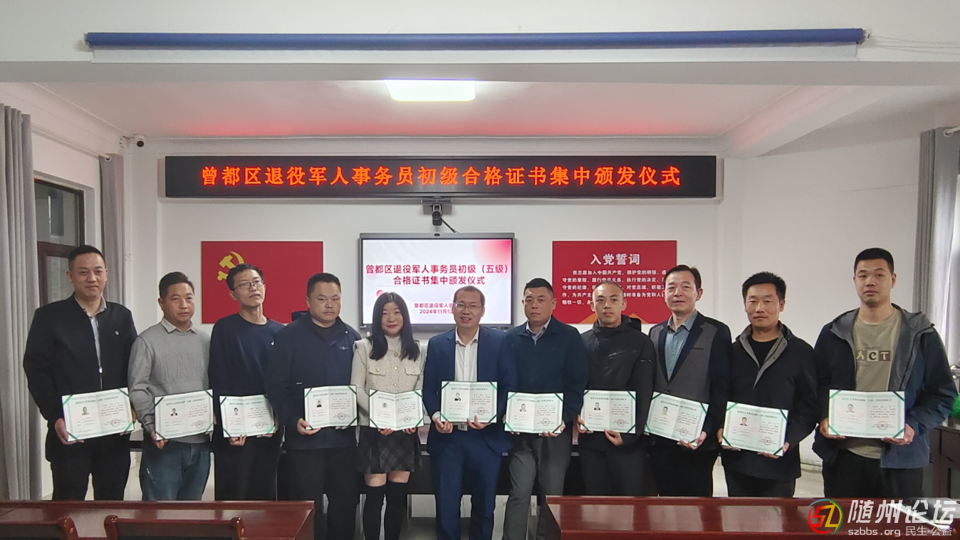 11月12日下午,全區(qū)退役軍人事務員初級(五級)培訓合格證書集中頒發(fā)儀式在曾都區(qū)退役軍人事務局舉行,11個鎮(zhèn)辦的退役軍人事務工作人員代表參加。 “退役軍人事務員”是第一個由退役軍人事務部歸口管理、專門為 ...