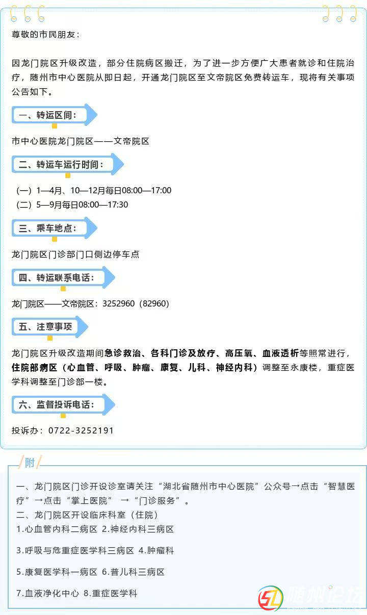 關(guān)于隨州市中心醫(yī)院龍門院區(qū)——文帝院區(qū)開通免費轉(zhuǎn)運車的公告