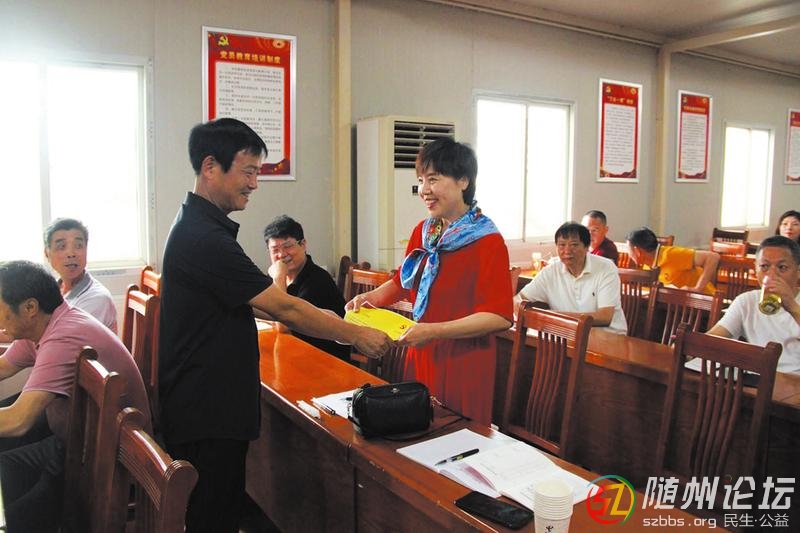 近日,廣水市財政局為55名(含退休黨員14名)7月份入黨的同志過集體“政治生日”。圖為該局工作人員為“過生日”的黨員贈送印有黨徽、入黨誓詞、入黨時間以及生日寄語的特別賀卡。 (隨州日報特約記者黃萍、 ...